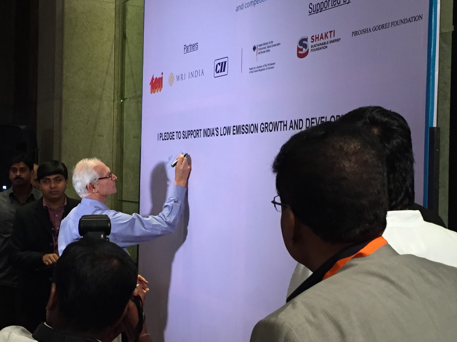 Jamshyd Godrej signing a pledge to support India’s low emission growth and development.